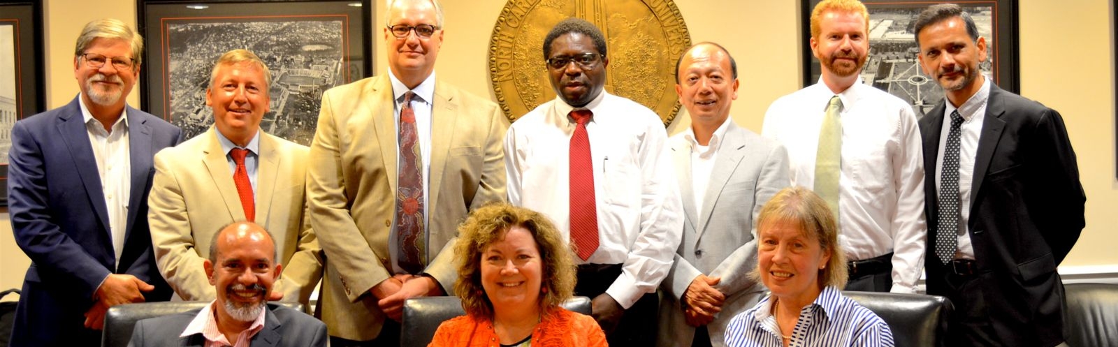 In the picture (left to right standing): Steve Lommel, Dean Linton, Provost Warwick Arden, Appolinaire Djikeng, Vice Provost Bailian Li, David Dixon, José Cisneros (left to right seated): José Ascencio-Ibanez, Jean Ristaino, and Linda Hanley-Bowdoin.